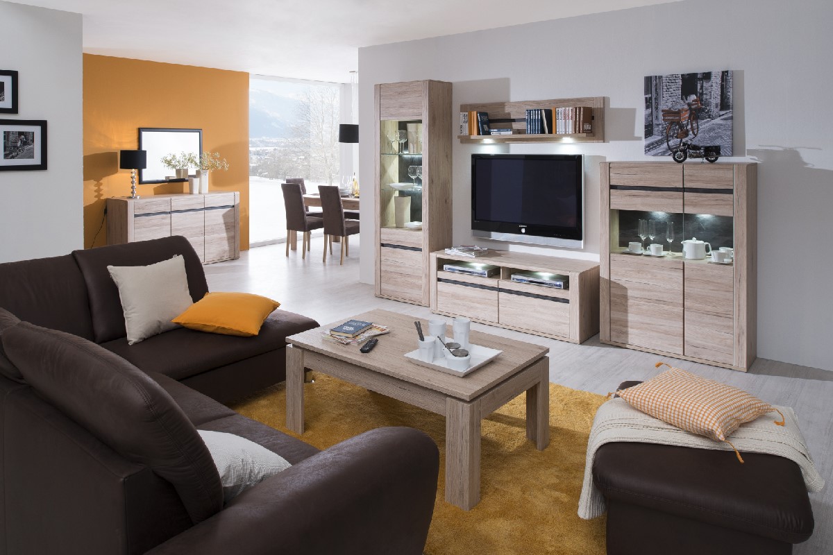 Na voljo v kombinaciji hrast San remo sand / hrast San remo sand. Dnevnosobni sestav z mehkimi zaobljenimi robovi. Ročaji vgrajeni v fronte in dopolnjujejo ravne linije elementov. Na voljo več vrst elementov s katerimi si sestavite dnevno sobo po vaših željah....