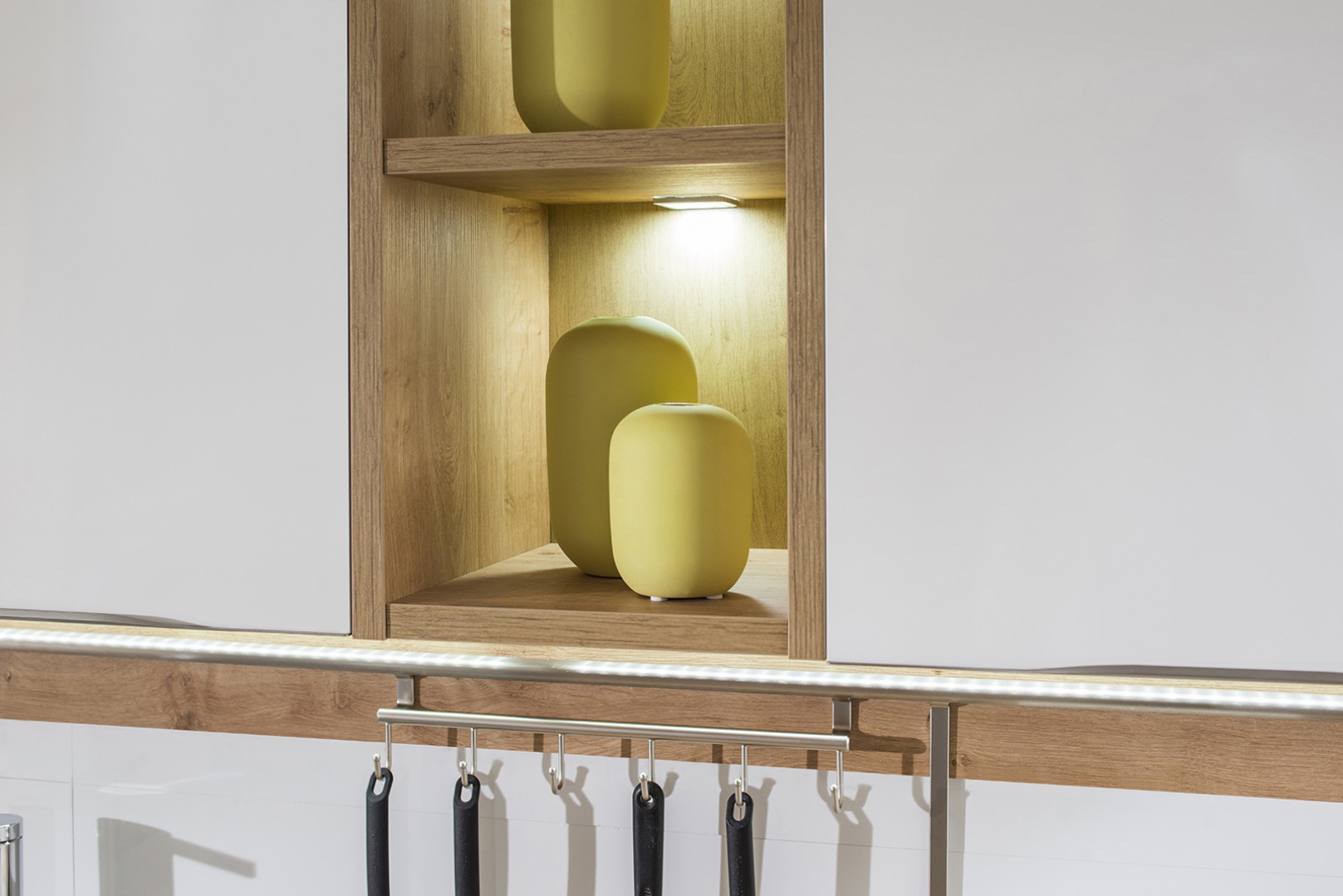 Model kuhinje Gala odlikuje moderen dizajn, svež videz in širok nabor elementov za individualno načrtovanje. Posebnost kuhinje so nasadni ročaji, kateri so manj vpadljivi in dajo kuhinji moderen ter trendovski izgled.